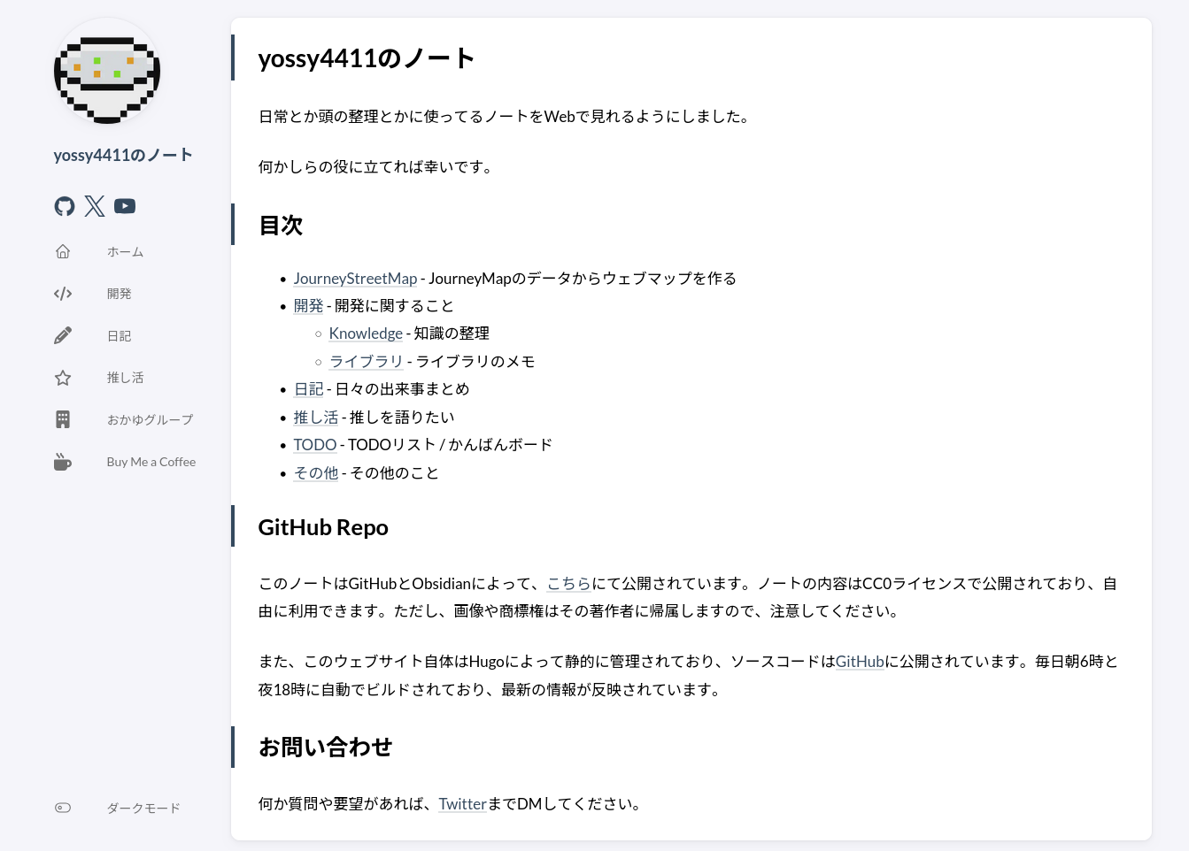 今日の作業 Web版ノートの機能性向上 これには以下のものを含みます。 トップページの追加 左サイドのメニューの追加 ソーシャルアイコンの追加 Buy Me a Coffeeの登録 まず銀行口座が要るらしい。 親に頼もうトホホギス