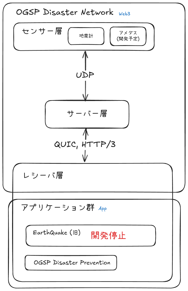 OGSP Disaster Networkでは、大きく分けてサーバー層、センサー層、レシーバ層の3つのレイヤーがある。サーバーを介して相互に通信が可能であり、これらすべてのレイヤーがWeb3のノードとして機能する。